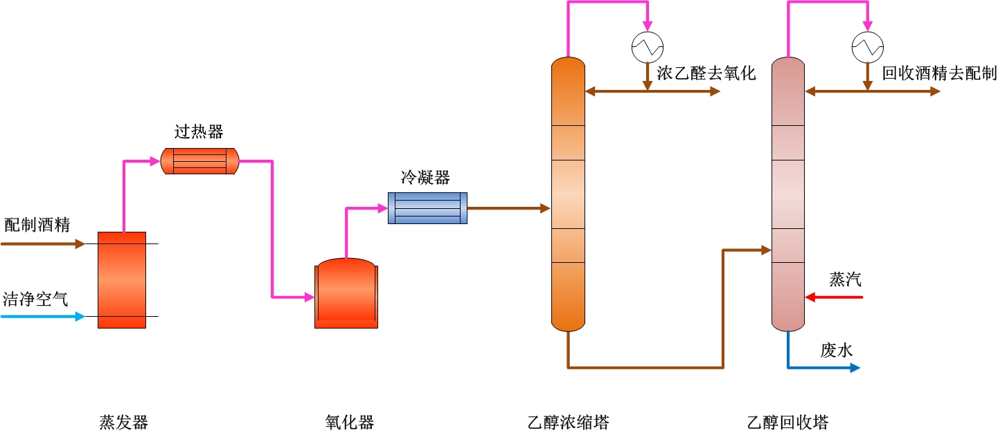 配制好的酒精送入蒸发器蒸发,同时加入空气,出蒸发器的气相混合物经过热后进入氧化器,在催化银的作用下,乙醇转化为乙醛,乙醛冷凝后进入乙醛浓缩塔,浓缩后的浓乙醛去乙醛氧化工序使用,未反应的乙醇通过回收塔回收返回乙醇配制间。