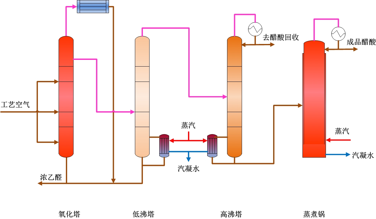 浓乙醛自塔底送入氧化塔,同时加入醋酸锰,氧化塔分为五段,每段均通入空气,在氧化塔内,乙醛被氧化成醋酸,塔顶未反应气体进冷凝器,冷凝液回氧化塔底,不凝气排放,粗醋酸送入低沸器。在低沸塔内,醋酸锰被分离下来,送回氧化塔,塔顶醋酸蒸汽自塔中部进入高沸塔。乙酸甲酯等低沸物在高沸塔内上升至塔顶,冷凝后部分采出的稀酸送入蒸发锅。在蒸发锅内,醋酸被蒸发自塔顶,冷凝、冷却后即得到成品醋酸,塔釜少量高沸物定期清理。